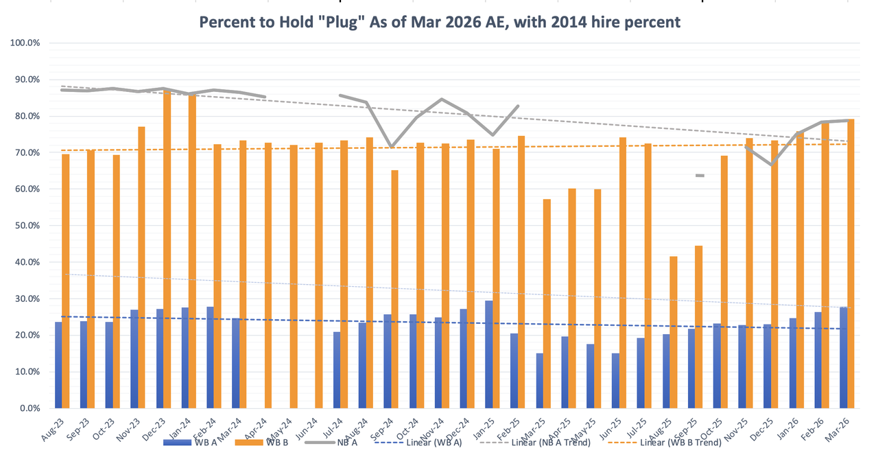 [Aug]Nothing far out of the norm. Though WB A went more junior than the Jul AE, it’s still slightly more senior than the last year or so, and still solidly in the 2000/2001 hires (and 1500 numbers from a 2014 hire). Interesting to see NB A go a little more senior than anytime in the post Covid era after being very stable at about 86-87%. WB B is within a percent and a half of the recent trends