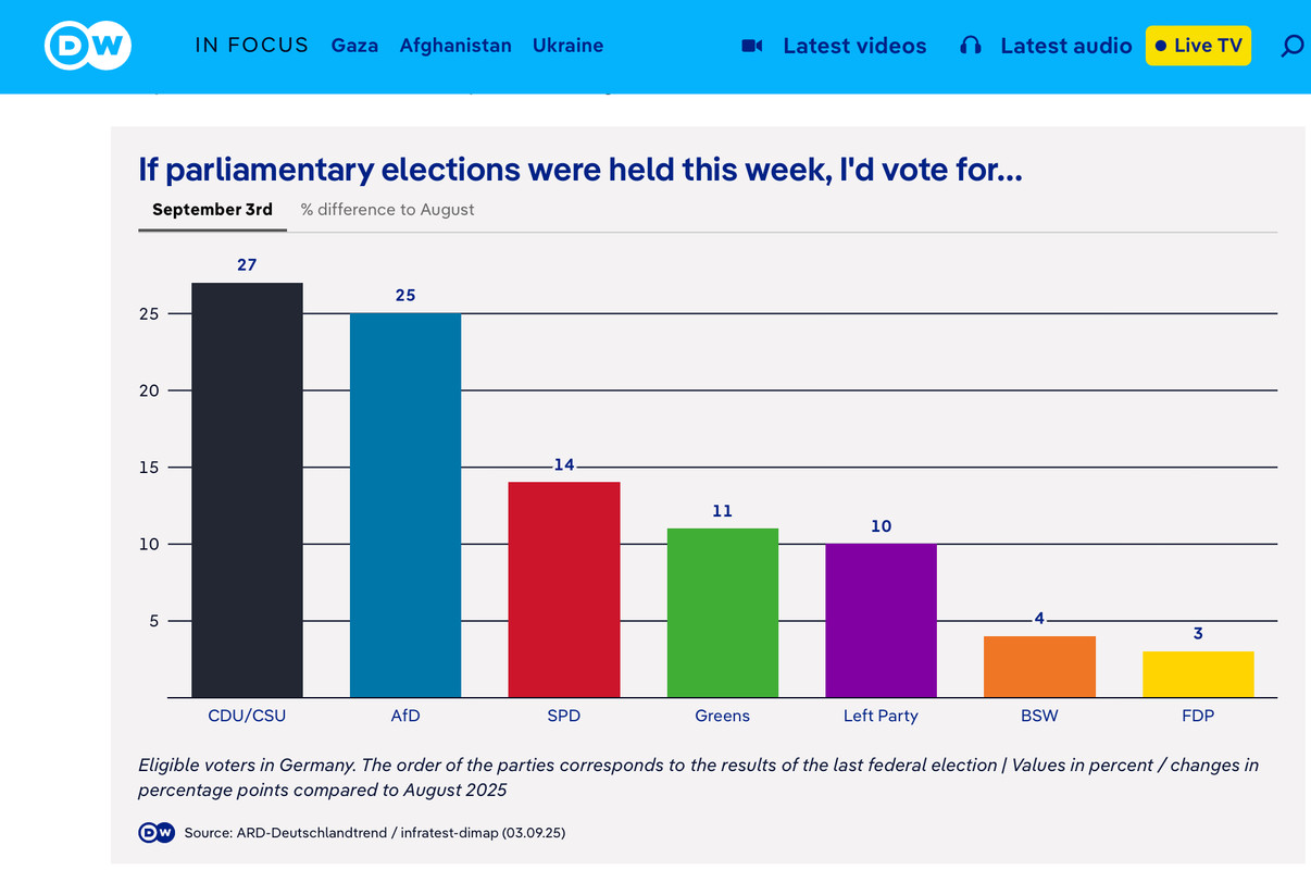 Asked about their voting intentions, if the next federal election were to take place this Sunday, participants offered a snapshot more or less comparable to the last election. Some 27% said they'd vote CDU/CSU, the same share as in August, while the SPD's figure rose by one point to 14%. The populist right-wing AfD climbed to 25%, its best score to date but only one point higher than last month, while the Greens slipped by a point to 11% and the Left Party held steady on 10%.