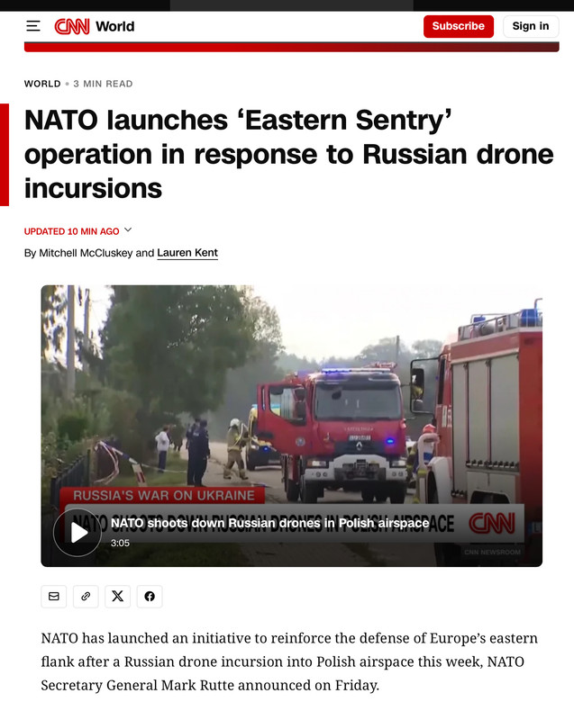 So, yeah, the violation of Poland airspace by the Russian drones is an escalation and everybody ought to be looking at the implications and potential actions, but it’s wrong to think that Article Four or Article Five has much to do about it. They are somewhat enabling but by no means compelling. They basically just green light NATO nations doing what they were going to do anyway. Some NATO countries (Hungary, Slovakia, Spain, for instance) weren’t going to do anything before and probably still won’t. A lot of NATO countries simply can’t do much after 35 years of underfunding their own militaries. A NATO no-fly zone over Poland might stop (or at least slow down) future drone overflights but does nothing but restore the status quo ante, not really helping Ukraine that much.