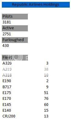 If the purchases happened today, that is a pretty accurate assessment of the RAH fleet makeup. In six months, though, those CRJs will be pretty much extinct, and the 717's will be starting to go away. And, if Bedford's public statements bear any fruit, you will see the number of E190's going up to match the decline of 717's. We can hope that the number of new jets surpasses the number of returned aircraft, and that the number of furloughed pilots goes down. Also, there may be the need to add in the Lynx pilots and aircraft to your table...no word from the Reverend yet on his plans with Lynx. Also, Bedford seems to want to do whatever it takes to keep Frontier entirely seperete from the RAH seniority list. He may be planning to sell off 50% of his stake in Frontier immediately so as to not be required to integrate the two companies per the RAH scope. So in the end the total RAH seniority list may be closer to 2500 pilots, with only E 140/145/170/175/190 aircraft, and a few 717's until Boeing takes them all back.