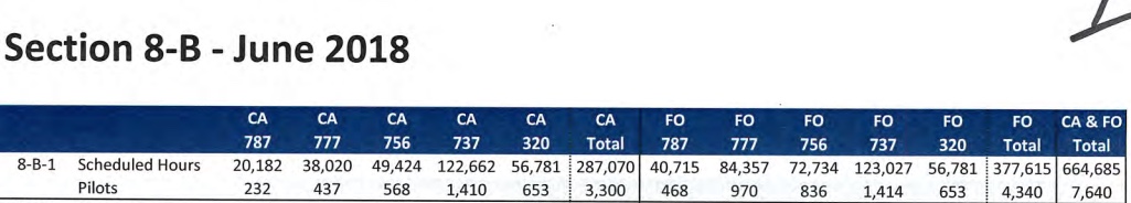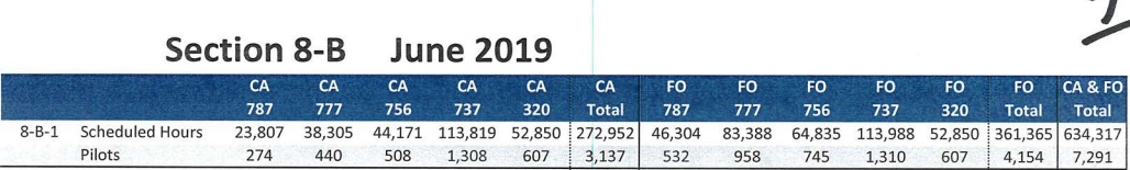 I usually look at the other chart now labeled "pilot block hours (credit)." The 2018 chart is labeled "aircraft hours." 2019 shows a YOY increase of 6100 hours. I vaguely remember the union saying the total time included deadhead built into pairings. That chart also doesn't include FO/augmented hours. If you included the FO/augmented hours, we are up an additional 7000 hours primarily on the 787 FO side. Most other fleets are nearly identical to last year, 756 down slightly and A320 picks up 2000 hours from the 737.
